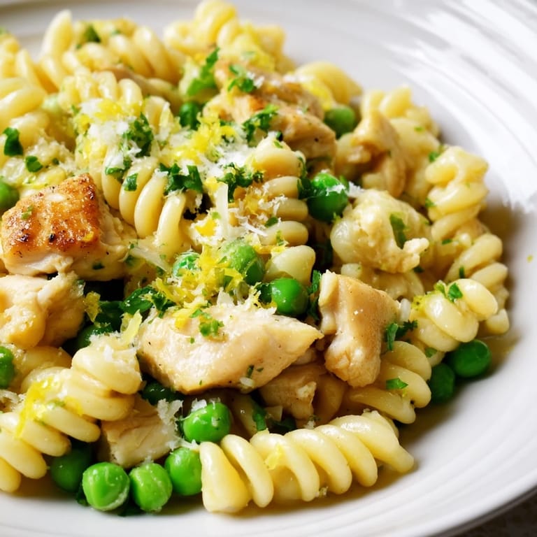 - Toss in the peas and chicken to warm through, then add your cooked pasta. Pour in the Parmesan, lemon zest, and juice, tossing constantly. Add that pasta water a splash at a time until the sauce lightly coats everything in this glossy, beautiful way.