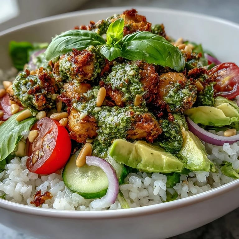 For a lower-carb option, substitute the jasmine or basmati rice with cauliflower rice or quinoa. Both alternatives pair well with the pesto chicken and maintain the bowl's satisfying texture.