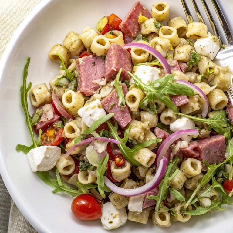 Save Last Sunday I stood at my kitchen counter assembling this salad while my neighbor leaned over the fence asking what smelled so good. It was just pasta and cold cuts but something about the zesty vinegar hitting the garlic made the whole yard feel like an Italian deli. My sister says I am obsessed with these viral grinder salads and maybe she is right but watching the arugula wilt slightly into the warm pasta taught me that the best flavors come from letting things settle into each other.